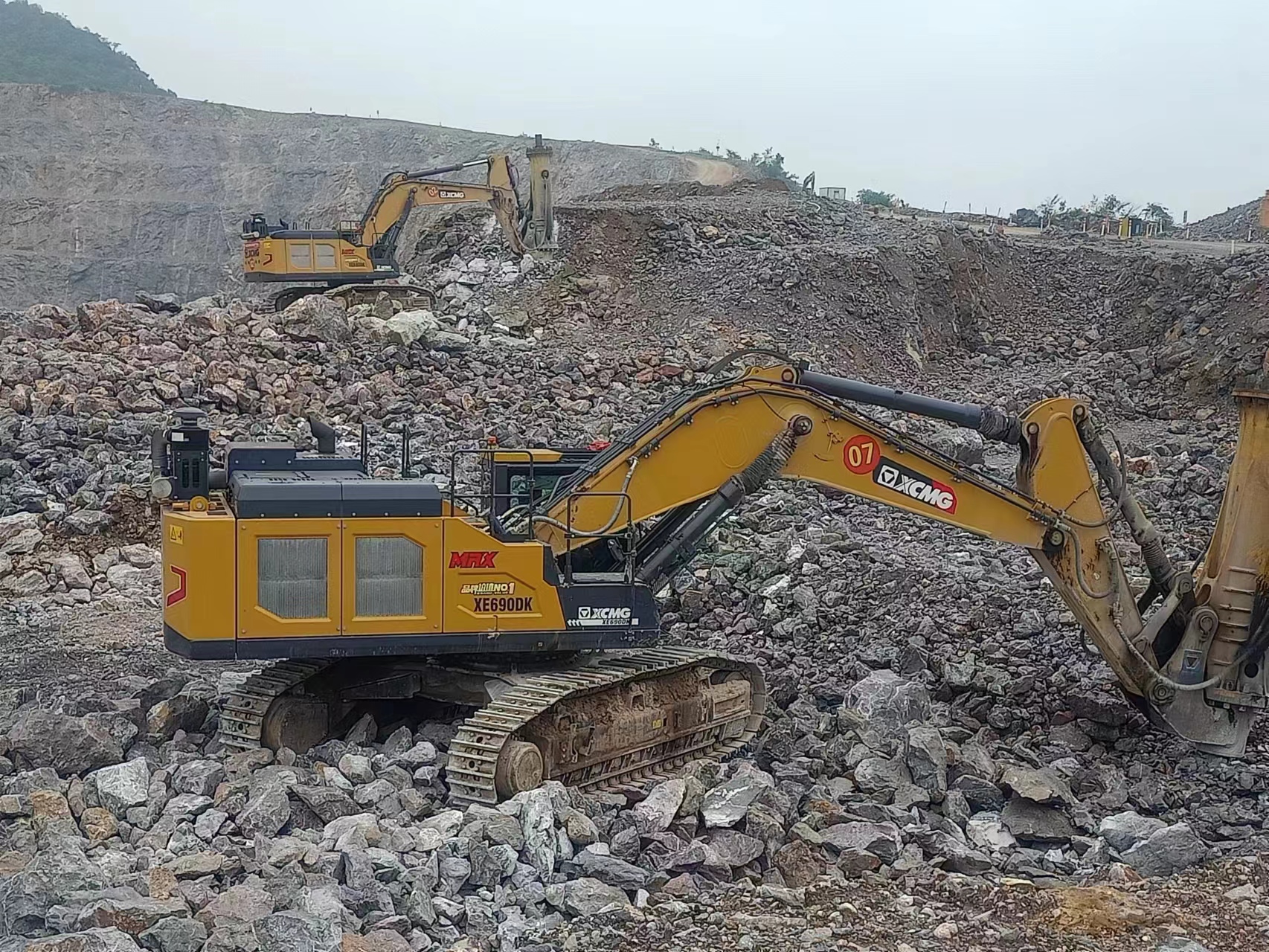 徐工XE690DK車型搭配HB5300,每小時油耗32L以下,油門3檔,破碎效率B3!